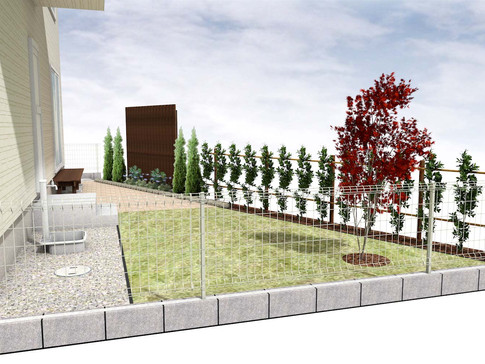 デザインとしては、玄関の階段を斜めにして、アプローチの乱形石張りをアール形状にすることで、玄関までの距離が視覚的に長くなったような感じになります。