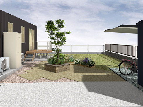そこに、テラス・花壇・芝・サイクルポートを設置し、駐車場も広げます。