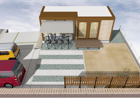 2台分の車を停められるように駐車場を拡張し、駐車場の奥には駐輪スペースとしてサイクルポートを設置します。