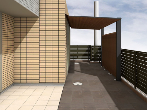 リビング前には透水性平板を敷き詰め、リクシルのテラスSCにダウンライトを設置して屋根を付けます。